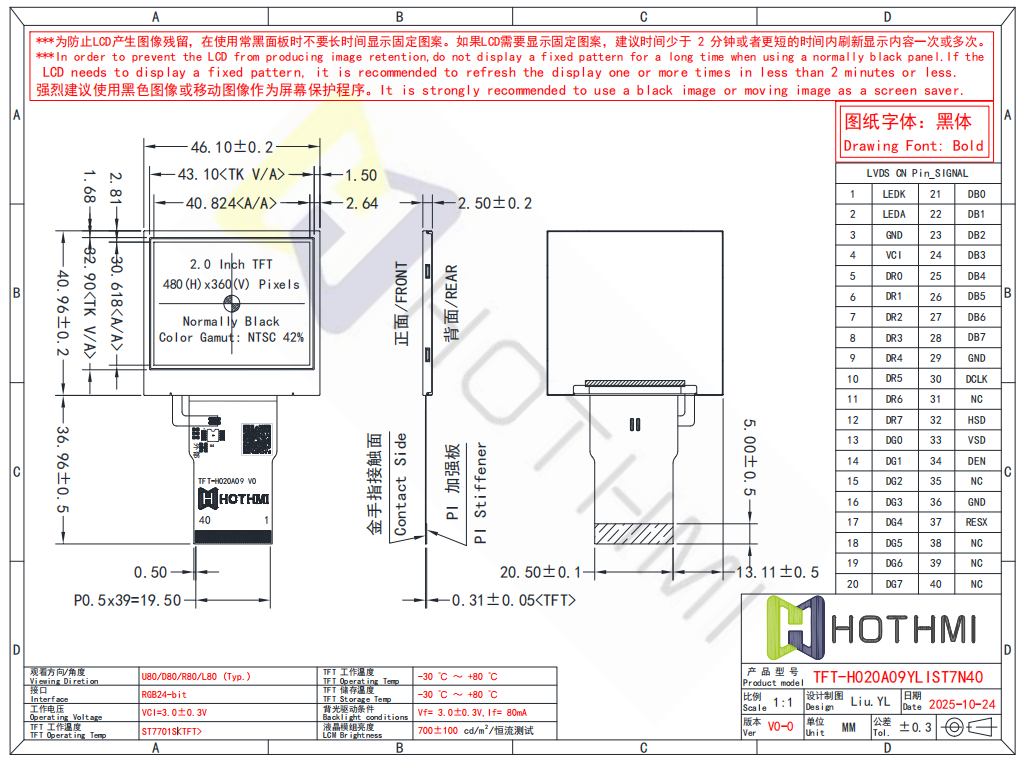 | 2英寸480x360 TFT LCD顯示屏,帶RGB接口 TFT-H020A09YLIST7N40 | TFT顯示屏 | 480x360 |