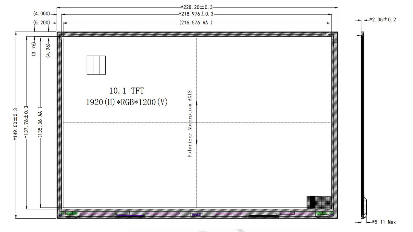 228.2x149x2.35 | 10.1 | 10.1 | 216.576x135.36 | IPS全視角 | 1000cd/m2 | FFC-30 pin | eDP | 防靜電ESD 8KV | -20~70℃ | +3.3 V | ||