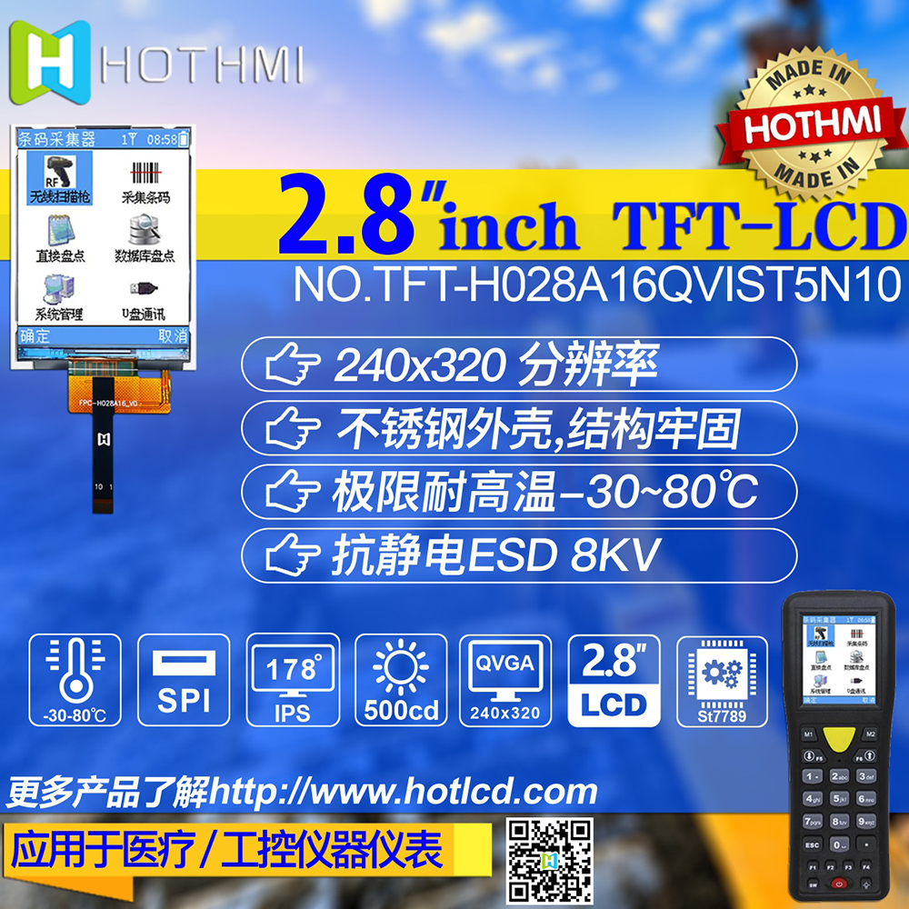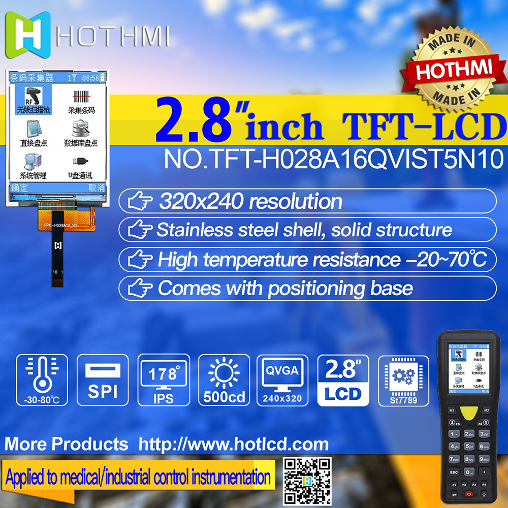 Tft-h028a16qvist5n10 is a 2.8-inch full-color TFT LCD module with a resolution of 240x320 pixels and an aspect ratio of 3:4. TFT module uses ST7789V driver IC, support MCU interface. The TFT module with IPS panel has the advantage of wide viewing Angle (left 80 degrees/right 80 degrees/upper 80 degrees/lower 80 degrees), typical contrast ratio is 800:1, and the module brightness is up to 500 nits (typical value). The operating temperature of the module ranges from -30 ° C to +80 ° C, and the storage temperature ranges from -30 ° C to +80 ° C.